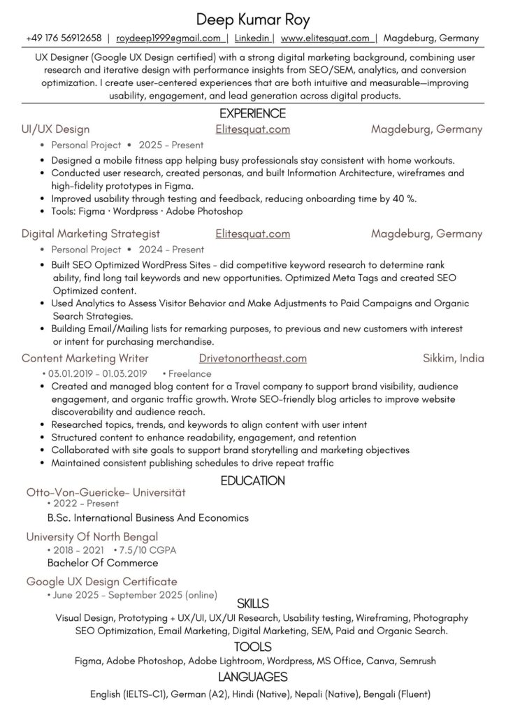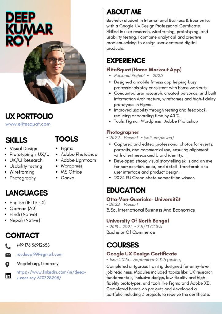 deepkumarroy DEEP KUMAR ROY Instagram Linkedin Hello! I'm Deep, a UX Designer currently based in Magdeburg, Germany. Creating engaging and intuitive digital experiences across all domains. UX PROJECTS Elitesquat:Home workout Mobile AppDesign Elitesquat website Design coming soon(Work in progress) UX RESUME Photography Photos
