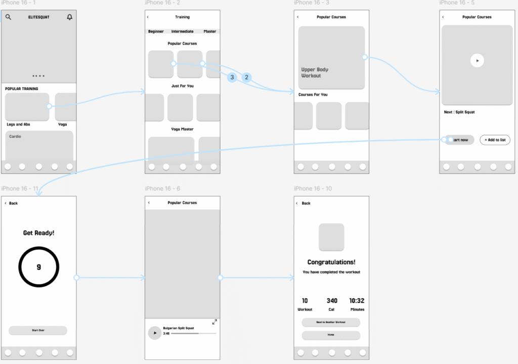 Final UI screens (Home, Workout player, Progress page, etc.)