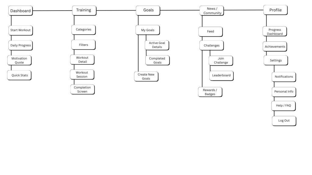 “I structured the app around five main sections — Home, Training/Workouts, Goals, Community, Profile — to make key actions reachable within two taps.”